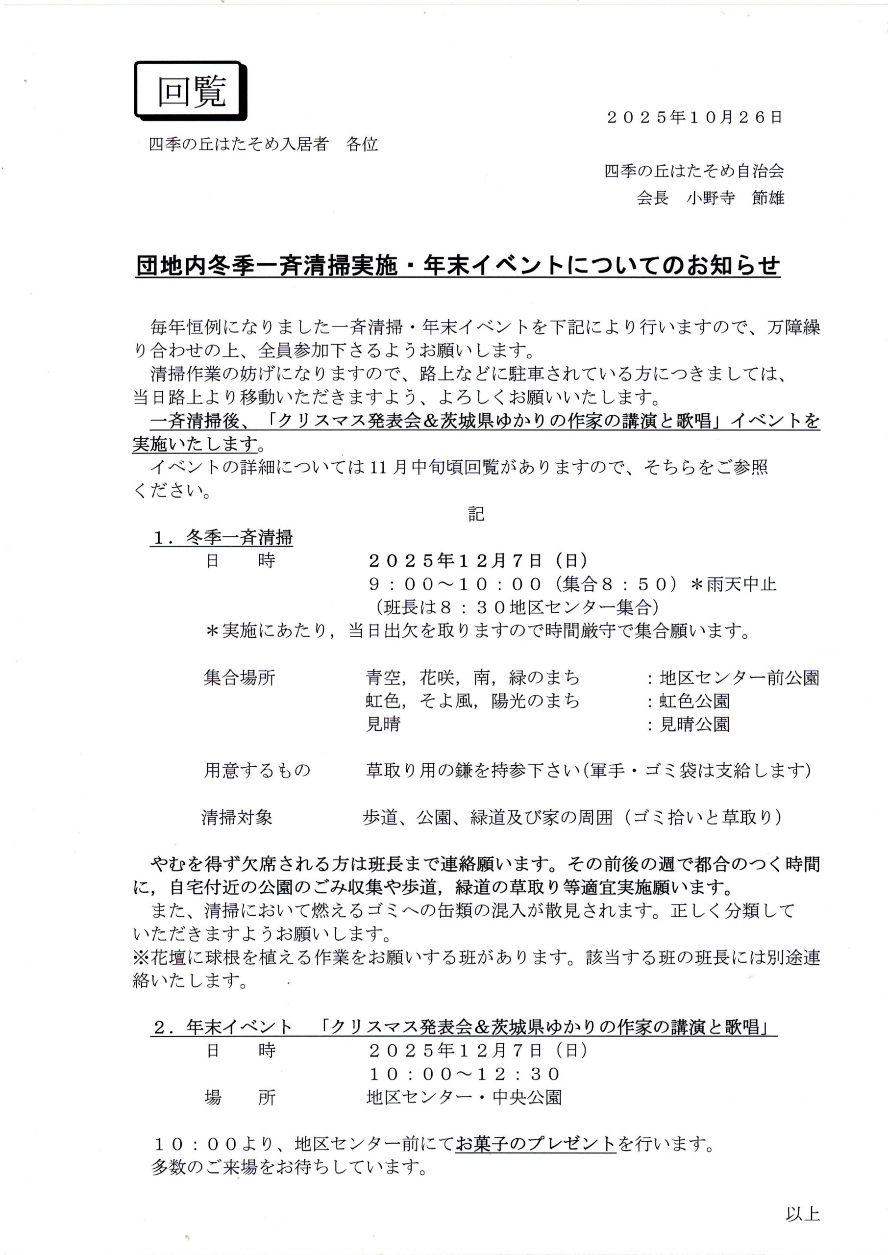 - 回覧板情報2025年11月25日✨【ご案内】年末イベントのお知らせ(12月7日(日)団地内冬季一斉清掃後実施)